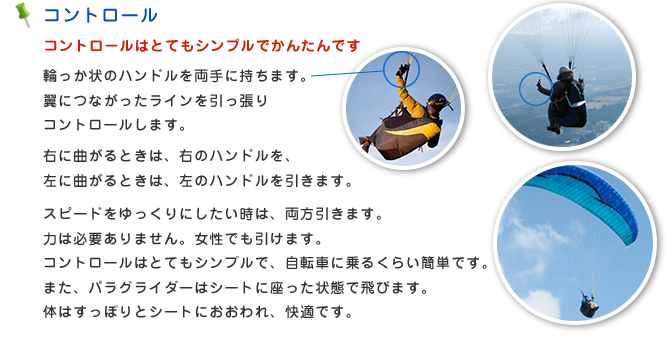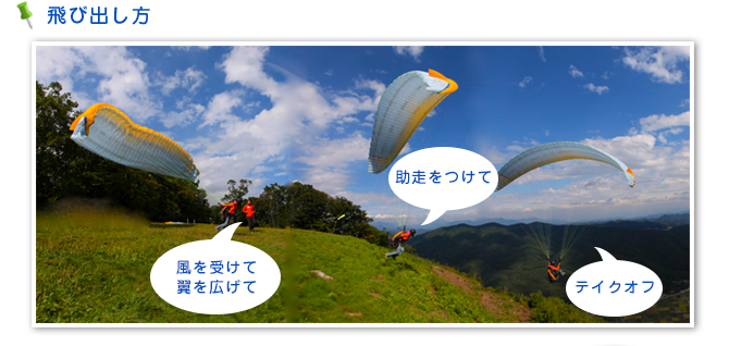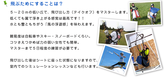 上昇気流に乗って高く、長く飛ぶソアリング技術を学び充分な飛行経験の中で安全なフライトのための判断力をつけます。